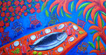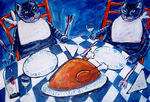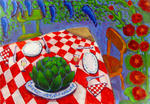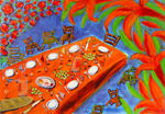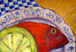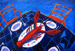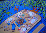 2007Het derde schilderij in de serie van de vrolijk gedekte tafel, maar dan nu met een grote vis erop. Op bestelling gemaakt.