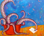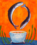 2013Samen soep eten verbroedert, en daarom een serie over soepen. Dit schilderij verenigt een aantal favorieten: vis, kleur, beweging en humor.