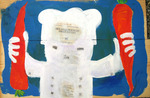 2011Op de deksel van een wijnkistje maakte ik de kok met de wortels. Onderlaag is een cryptogram en een recept uit de krant. Het beeld is gebruikt als omslag voor een kookboek.